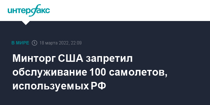 Москва. 18 марта. INTERFAX.RU - Минторг США обнародовал список из 100 связанных с РФ коммерческих и частных самолетов, которым в рамках мер экспортного контроля запрещено где-либо оказывать обслуживание.
