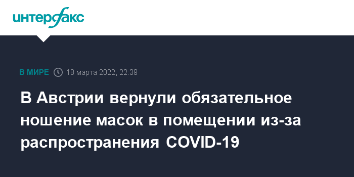 Москва. 18 марта. INTERFAX.RU - Министр здравоохранения Австрии Йоханнес Раух заявил, что правило об обязательном ношении защитной маски в помещении вернется в силу на следующей неделе из-за роста заболеваемости коронавирусом COVID-19, сообщает в пятницу австрийское радио ОРФ.