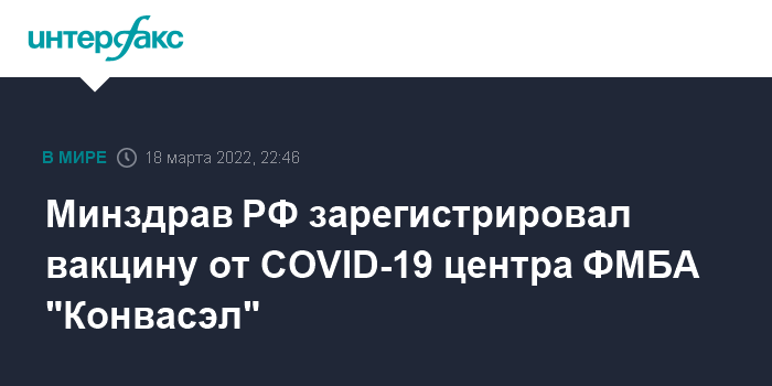 Москва. 18 марта. INTERFAX.RU - Минздрав России зарегистрировал вакцину от коронавируса Санкт-Петербургского НИИ вакцин и сывороток Федерального медико-биологического агентства (ФМБА) "Конвасэл", следует из государственного реестра лекарственных средств.