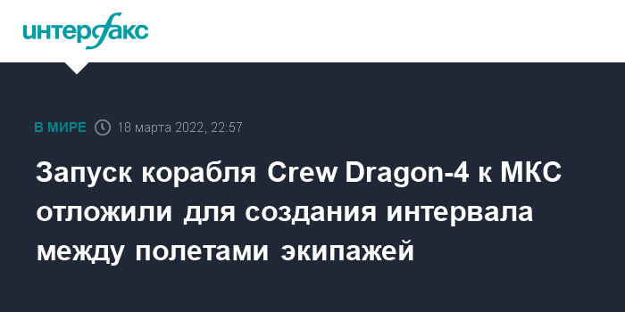 Москва. 18 марта. INTERFAX.RU - Запуск космического корабля SpaceX Crew Dragon с четырьмя астронавтами на борту к Международной космической станции (МКС) в рамках миссии Crew Dragon-4, запланированный на 15 апреля, переносится и состоится не ранее чем 19 апреля в целях создания интервала между полетами экипажей к станции, сообщает НАСА.
