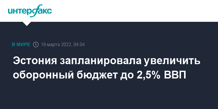 Москва. 19 марта. INTERFAX.RU - Эстония планирует увеличить оборонный бюджет с 2,3% до 2,5% валового внутреннего продукта (ВВП), заявил министр обороны Калле Лаанет.