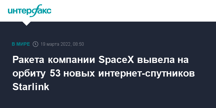 Москва. 19 марта. INTERFAX.RU - Тяжелая ракета-носитель Falcon 9 в субботу вывела на орбиту очередную партию из 53 мини-спутников для пополнения орбитальной группировки глобальной сети интернет-покрытия системы Starlink, сообщила компания-разработчик SpaceX.