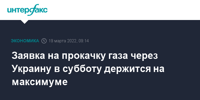 Москва. 19 марта. INTERFAX.RU - Загрузка украинского газотранспортного коридора в субботу держится на максимальном уровне долгосрочного контракта (40 млрд куб. м в год, или 109 млн куб. м в сутки).