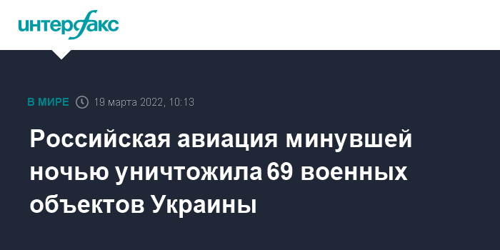 Москва. 19 марта. INTERFAX.RU - Российская авиация минувшей ночью уничтожила 69 военных объектов Украины, в том числе три системы ПВО С-300, сообщил официальный представитель Минобороны РФ Игорь Конашенков.