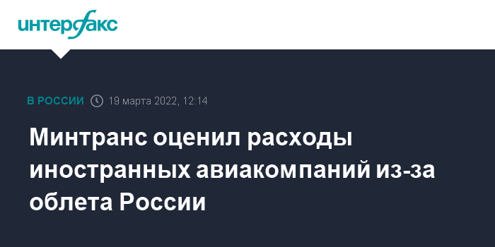 Москва. 19 марта. INTERFAX.RU - Минтранс оценил дополнительные расходы иностранных авиакомпаний, которые на фоне взаимных ограничений вынуждены облетать воздушное пространство РФ.