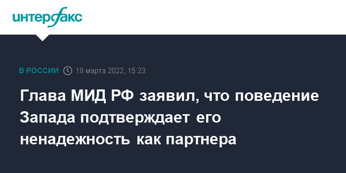 Москва. 19 марта. INTERFAX.RU - Запад подтвердил свою ненадежность как партнер по экономическому сотрудничеству и место для хранения золотовалютных резервов, заявил глава МИД РФ Сергей Лавров.
