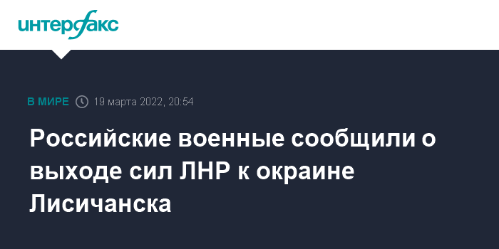 Москва. 19 марта. INTERFAX.RU - Министерство обороны России заявило, что силы Луганской народной республики вышли с севера к окраине города Лисичанск и ведут уничтожение украинских формирований, которые отступили из города Рубежное.