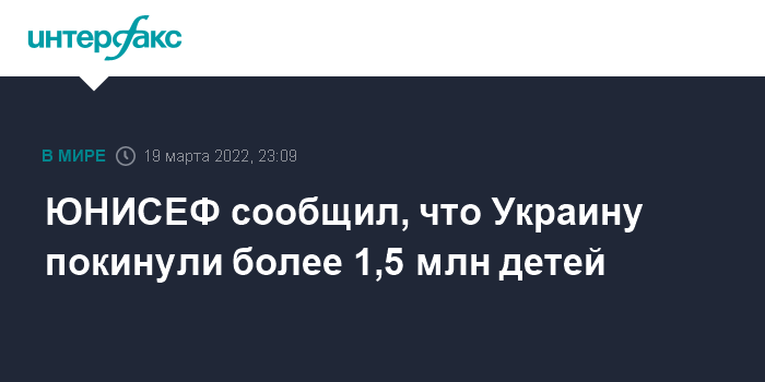 Москва. 19 марта. INTERFAX.RU - Детский фонд ООН (ЮНИСЕФ) заявил в субботу, что с 24 февраля более 1,5 млн детей в результате событий на Украине стали беженцами, сообщается в пресс-релизе ЮНИСЕФ.