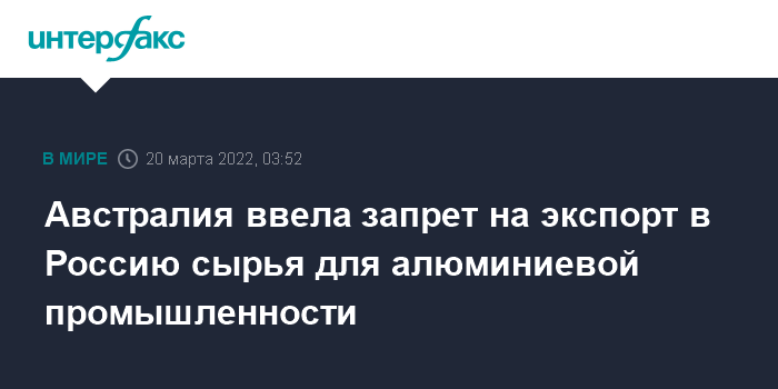Москва. 20 марта. INTERFAX.RU - "Правительство Австралии немедленно вводит запрет на экспорт в Россию глинозема и алюминиевых руд, включая бокситы", - говорится в опубликованном заявлении.