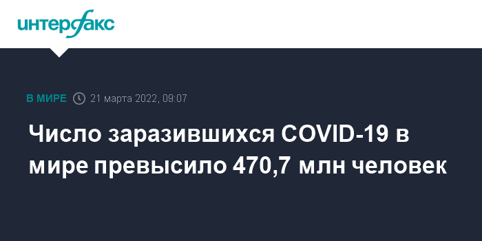Москва. 21 марта. INTERFAX.RU - Число зарегистрированных случаев заражения коронавирусом в мире на утро понедельника достигло 470 740 762, свидетельствуют данные американского университета Джонса Хопкинса.