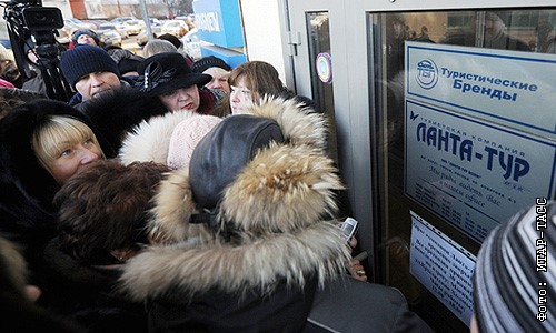Пострадавшие у входа в главный офис туристической компании "Ланта-тур", объявившей о своем банкротстве.