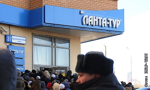 Пострадавшие у главного офиса туристической компании "Ланта-тур", объявившей о своем банкротстве.