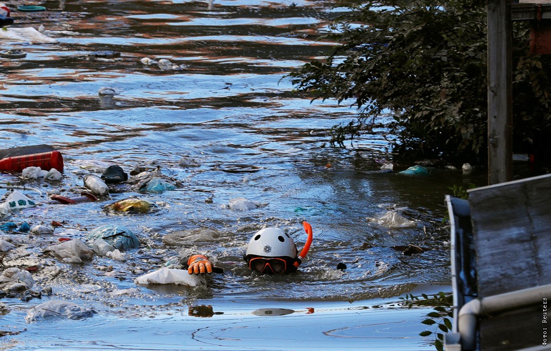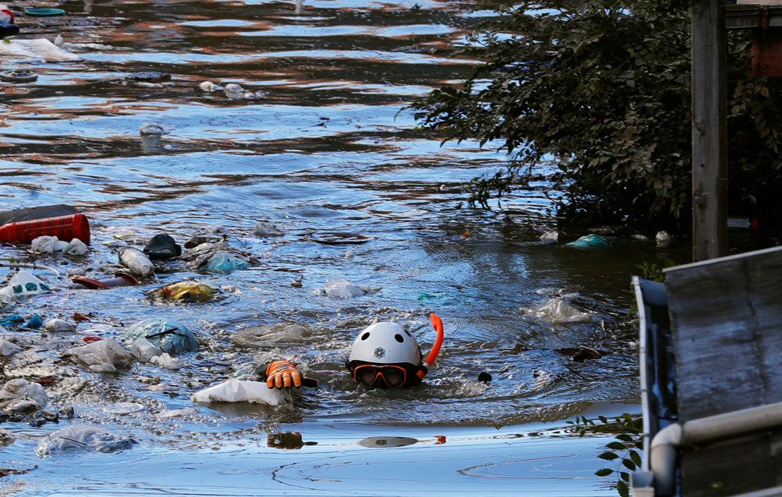 Спасатель вплавь проверяет затопленный жилой район в Кавасаки