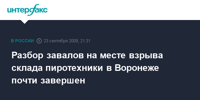 Воронеж. 23 сентября. INTERFAX.RU - В Воронеже на месте взрыва склада пиротехники в основном завершены работы по разбору завалов, начался вывоз мусора, сообщили "Интерфаксу" в пресс-службе областного МЧС.