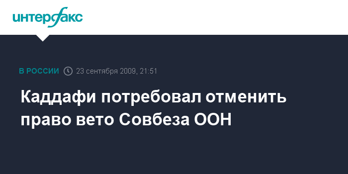 Нью-Йорк (ООН). 23 сентября. INTERFAX.RU - Ливийский лидер полковник Муаммар Каддафи в среду в своем первом выступлении с трибуны Генеральной ассамблеи ООН заявил, что право вето, которым владеет Совет Безопасности ООН, противоречит уставу ООН.