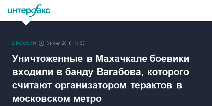 Москва. 3 июня. INTERFAX.RU - В ходе спецоперации в Махачкале убиты трое боевиков из банды Магомедали Вагабова, который считается одним из организаторов терактов в московском метро, сообщили "Интерфаксу" в пресс-службе УФСБ России по Дагестану.