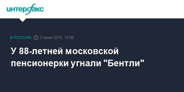 Москва. 3 июня. INTERFAX.RU - Автомобиль "Бентли" стоимостью около 15 млн руб. похищен в четверг утром на юго-западе Москвы, сообщил "Интерфаксу" источник в правоохранительных органах города. Иномарка была похищена от жилого дома, расположенного на улице Вавилова. По документам автомобиль зарегистрирован на 88-летнюю москвичку. Сотрудники правоохранительных органов ищут авто пенсионерки.