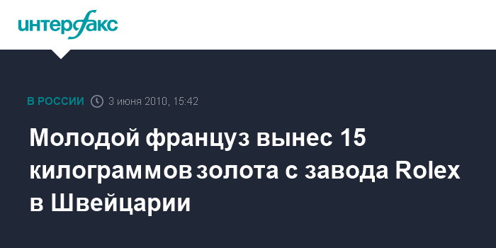 Москва. 3 июня. INTERFAX.RU - Более 15 кг золота похитил с часового завода Rolex в Женве один из сотрудников этого предприятия. Злоумышленник задержан и помещен под стражу. Им оказался 22-летний гражданин Франции, который недавно устроился на работу на знаменитый часовой завод, сообщила в четверг швейцарская "Наша газета".