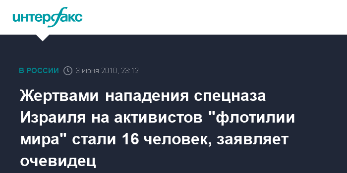 Жертвами нападения спецназа Израиля на активистов "флотилии мира" стали 16 человек, заявляет очевидец