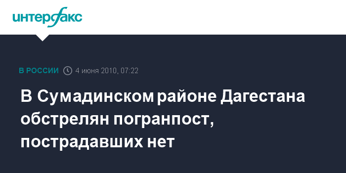 Ростов-на-Дону. 4 июня. ИНТЕРФАКС-ЮГ - Пост пограничного контроля в районе Гако (Дагестан) обстрелян неизвестными из гранатомета и автоматического оружия, сообщили агентству "Интерфакс-Юг" в правоохранительных органах Сумадинского района.
