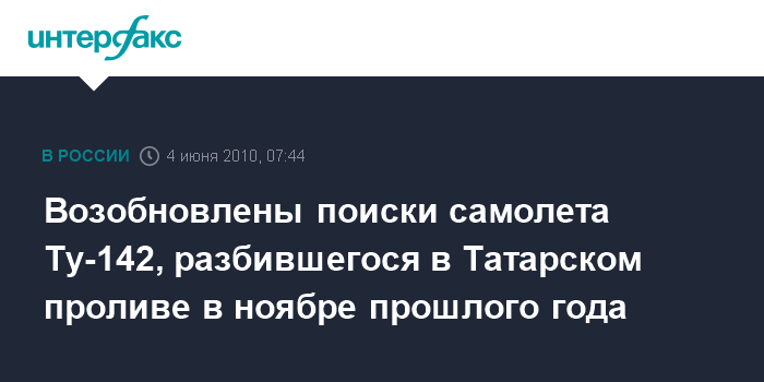 Владивосток. 4 июня. ИНТЕРФАКС-ДАЛЬНИЙ ВОСТОК - В Татарском проливе, разделяющим Сахалин и материк, возобновилась специальная операция Тихоокеанского флота (ТОФ) по поиску "черных ящиков" и тел пилотов с разбившегося в ноябре прошлого года самолета ТОФ Ту-142.