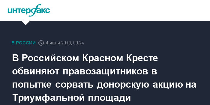 Москва. 4 мая. INTERFAX.RU – В подмосковном отделении общероссийской общественной организации "Российский Красный Крест" заявляют, что на законных основаниях проводили 31 мая акцию по добровольной сдаче крови на Триумфальной площади.