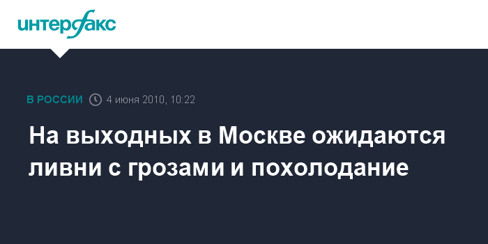 Москва. 4 мая. INTERFAX.RU – В конце недели погода в столичном регионе ухудшидся - ожидаются ливни и грозы, а также возможен град и шквальный ветер. По прогнозу Метеобюро Москвы и Московской области в пятницу ожидается облачная погода с прояснениями, пройдут ливневые дожди, днем возможно сильные и с грозами. Максимальная температура в черте города составит +25...+27, по области +23...+28.