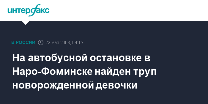 Москва. 22 мая. INTERFAX.RU - В подмосковном Наро-Фоминске вчера утром горожане обнаружен труп новорожденной девочки, сообщил "Интерфаксу" в источник в правоохранительных органах. Он добавил, что его нашли возле автобусной станции Нара.