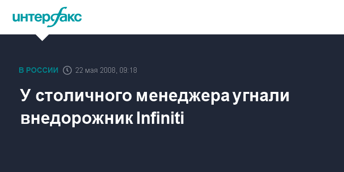 Vосква. 22 мая. INTERFAX.RU - Вчера в Москве неизвестные угнали джип "Инфнити-Премиум", который оценивается в 1 млн 700 тыс. рублей, сообщил "Интерфаксу" источник в правоохранительных органах.