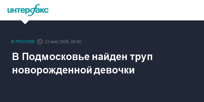 Москва. 22 мая. INTERFAX.RU - В подмосковном Наро-Фоминске обнаружен труп новорожденной девочки. Об этом сообщил "Интерфаксу" сегодня источник в правоохранительных органах.