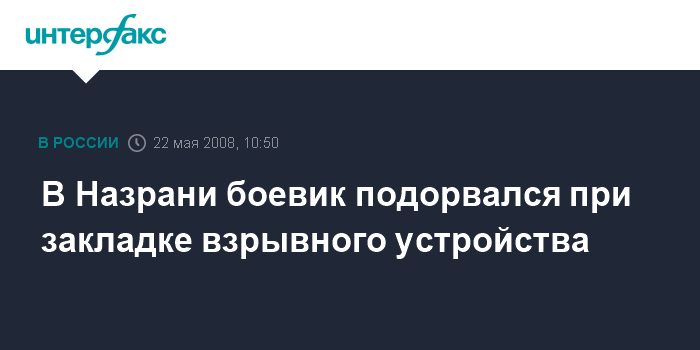 Москва. 22 мая. INTERFAX.RU - На площади Согласия в центре Назрани (Ингушетия) местный житель погиб в результате подрыва самодельного взрывного устройства.