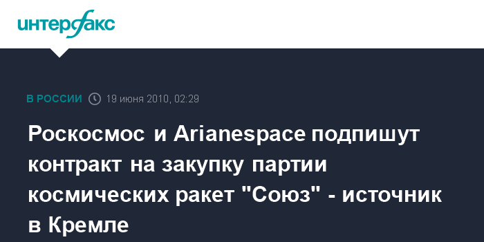 Санкт-Петербург. 19 июня. ИНТЕРФАКС-АВН - Роскосмос и французская компания Arianespace подпишут в субботу в Петербурге контракт на закупку дополнительной партии ракет-носителей "Союз", сообщил источник в Кремле.