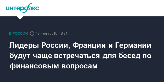 Санкт-Петербург. 19 июня. ИНТЕРФАКС - Лидеры России, Франции и Германии договорились встречаться чаще, в том числе для согласования позиций по реформированию мировой финансовой системы.