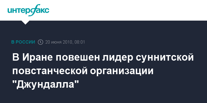 Москва. 20 июня. ИНТЕРФАКС - Лидер иранской повстанческой группировки "Джундалла" ("Солдаты Аллаха" - ИФ) Абдольмалек Риги был казнен через повешение, сообщает в воскресенье британская телерадиовещательная корпорация Би-би-си.