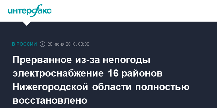 Нижний Новгород. 20 июня. ИНТЕРФАКС-ПОВОЛЖЬЕ - В Нижегородской области полностью восстановлено электроснабжение, которое было прервано в результате прохождения грозового фронта 12-13 июня, сообщили в воскресенье агентству "Интерфакс-Поволжье" в пресс-службе ГУ МЧС РФ по Нижегородской области.