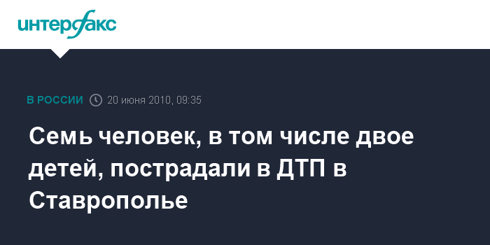 "В субботу в 7:44 мск в городе Зеленокумске произошло столкновение двух автомобилей. В результате ДТП пострадали семь человек, из них двое детей трех и пяти лет", - сообщил агентству "Интерфакс-Юг" в воскресенье руководитель пресс-службы ГУ МЧС РФ по Ставропольскому краю Олег Дегтярев.
