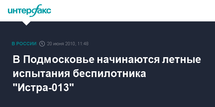Москва. 20 июня. INTERFAX.RU - Летные испытания беспилотного летательного аппарата комплекса воздушной разведки "Истра-013" разработки Истринского экспериментального электромеханического завода (ИЭМЗ) начнутся в ближайшее время, сообщил "Интерфаксу-АВН" директор ИЭМЗ Юрий Бажанов. "Беспилотник" разработан и изготовлен по заказу одной из силовых структур. Сейчас идет его отладка. Летом начнутся летные испытания. Их завершение можно ожидать в четвертом квартале", - сообщил Ю.Бажанов.