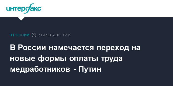 Москва. 20 июня. INTERFAX.RU - Премьер-министр РФ Владимир Путин поздравил российских медиков с профессиональным праздником. "Нужно переходить на новые формы оплаты труда в системе здравоохранения с тем, чтобы повышать ответственность медицинского персонала за качество медицинских услуг, которые вы оказываете гражданам России", - сказал В.Путин, выступая в воскресенье на торжественной церемонии вручения медицинской премии "Призвание".