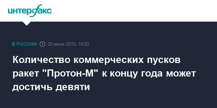 Москва. 20 июня. INTERFAX.RU - Восемь или девять пусков российских ракет-носителей тяжелого класса "Протон-М" с зарубежными космическими аппаратами связи намечается выполнить в 2010 году, сообщил "Интерфаксу-АВН" руководитель пресс-службы Государственного космического центра имени Хруничева Александр Бобренев.