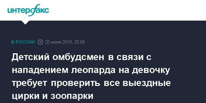 Москва. 20 июня. ИНТЕРФАКС - Уполномоченный по правам ребенка при президенте РФ Павел Астахов обращается в Генпрокуратуру, Минздравсоцразвития и Роспотребнадзор с просьбой проверить все выездные цирки и зоопарки в связи с нападением леопарда на девочку в Клину.