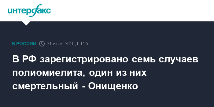 Москва. 21 июня. ИНТЕРФАКС - В России подтверждено семь случаев заболевания полиомиелитом, вспышка которого более месяца назад произошла в Таджикистане, сообщил "Интерфаксу" руководитель Роспотребнадзора, главный государственный санитарный врач РФ Геннадий Онищенко.
