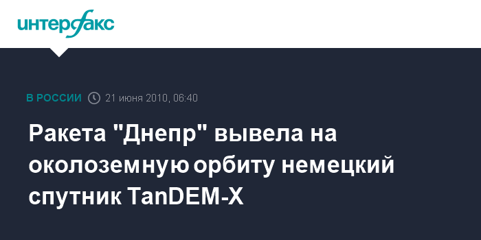 Москва. 21 июня. ИНТЕРФАКС-АВН - Германский радиолокационный космический аппарат TanDEM-X отделился от последней ступени российско-украинской ракеты-носителя "Днепр" и успешно вышел на околоземную орбиту.