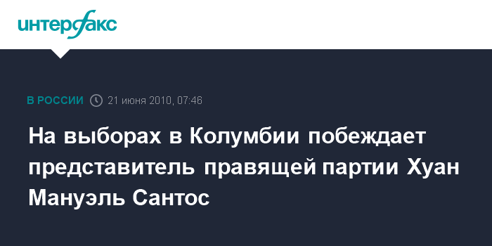 Лондон. 21 июня. ИНТЕРФАКС - На состоявшихся в Колумбии президентских выборах победу одерживает бывший министр обороны этой латиноамериканской страны Хуан Мануэль Сантос, сообщает британская телерадиовещательная корпорация Би-би-си.