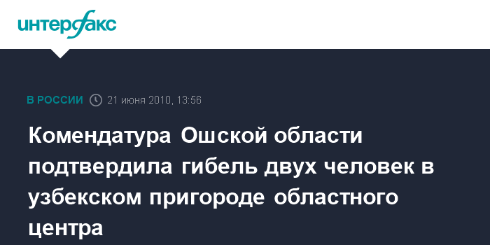 Москва. 21 июня. INTERFAX.RU - Комендатура Ошской области Киргизии заявила, что в результате "зачистки" в населенном узбеками пригороде областного центра погибли два человека. По словам представителя пресс-службы комендатуры, при самой "зачистке" погиб один человек, еще один скончался по дороге в больницу.