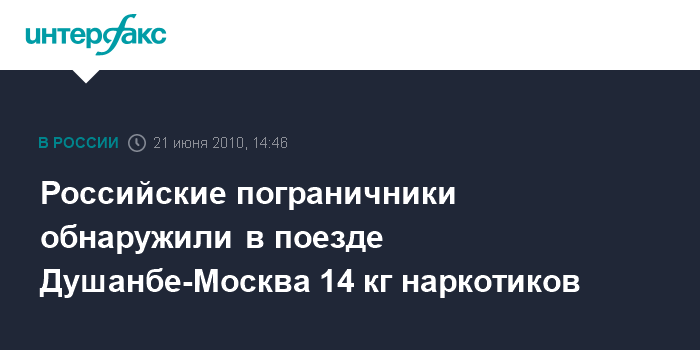 Москва. 21 июня. INTERFAX.RU - Сотрудники пограничного управления ФСБ России по Калмыкии и Астраханской области обнаружили в поезде, который следовал из Душанбе в Москву транзитом через Казахстан, почти 14 кг наркотиков, сообщил Центр общественных связи (ЦОС) ФСБ РФ. "В контрольно-пропускном пункте Аксарайский в ходе пограничного контроля поезда сообщением Душанбе-Москва в межпотолочном пространстве одного из вагонов были обнаружены 16 полиэтиленовых пакетов с наркотическим веществом", - сказано в сообщении ЦОС, которое поступило в "Интерфакс-АВН" в понедельник.