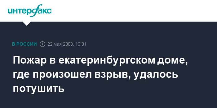 Москва. 22 мая. INTERFAX.RU - Пожар в жилом девятиэтажном доме в центре Екатеринбурга, случившийся после взрыва, ликвидирован, общая площадь возгорания составила порядка 50 кв.метров. Ранее сообщалось, что в четверг днем в Екатеринбурге на ул. Папанина произошел взрыв в жилом девятиэтажном доме. На месте происшествия обнаружены тела четверых человек. На теле одного из погибших обнаружен след травмы.