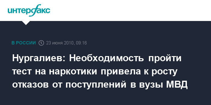 Москва. 23 июня. INTERFAX.RU - Многие абитуриенты вузов системы МВД РФ отказываются от поступления, узнав о необходимости проходить тест на употребление наркотиков, сообщил министр внутренних дел РФ Рашид Нургалиев.