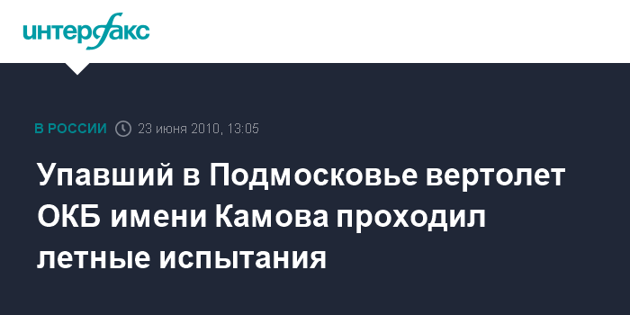 Москва. 23 июня. INTERFAX.RU – Потерпевший крушение в Подмосковье новейший вертолет Ка-60 ("Касатка") принадлежал ОКБ имени Камова и проходил летные испытания на базе завода вертолетного завода имени Миля.