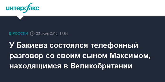 Москва. 23 июня. INTERFAX.RU – Курманбек Бакиев сообщил о телефонном разговоре со своим сыном Максимом и не назвал, в целях безопасности, местонахождение своих остальных родственников.