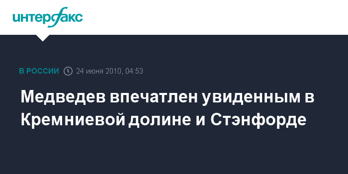 Стэнфорд. 24 июня. ИНТЕРФАКС - Президент РФ Дмитрий Медведев вдохновлен тем, что увидел в Силиконовой долине в Калифорнии, и с удовлетворением отмечает готовность американских компаний работать в России.